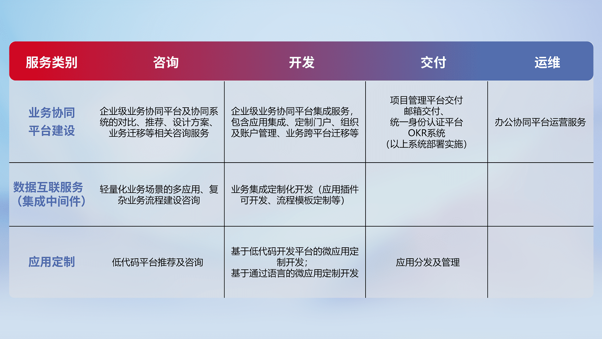 针对钉钉、、企微、、IDaas等平台级产品提供产品的规划、、、方案、、交付、、、定制化开发等服务,,实现如统一协同办公、、、、智能客户服务、、、、混合会议管理、、、智能数据查询、、、、等业务场景,,,,实现数字化转型。。。。